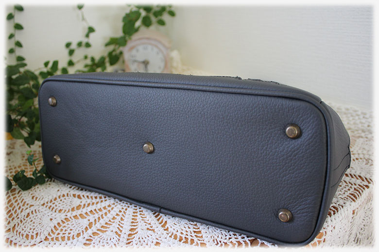 底部分は、硬い芯材を入れ底鋲が付いております。縁はパイピング処理をしております。
