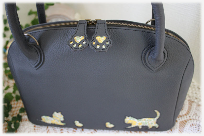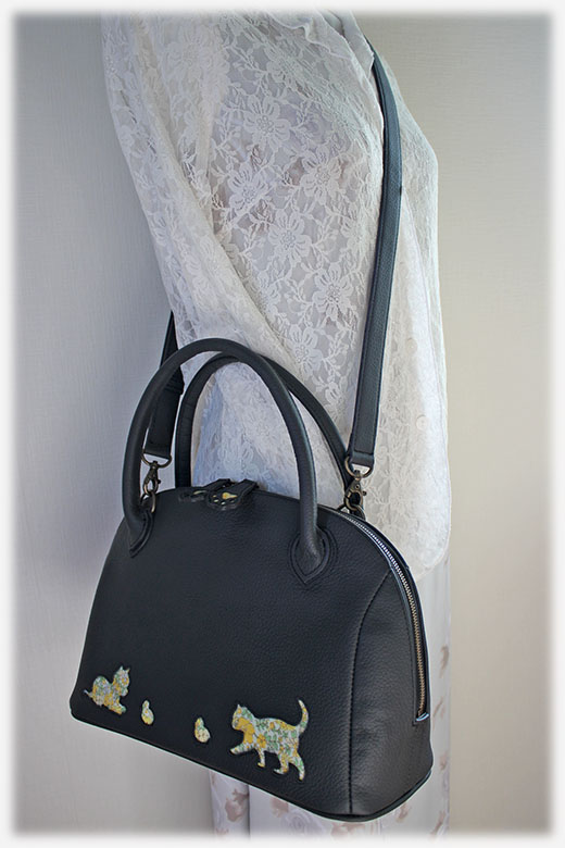 さて今回は、リバティ(Auley Gardends)と牛革を使ってブガッティバッグを作ってみました。今回もカッティング装飾をしており、猫とヒヨコが戯れている感じのデザインとなっております。